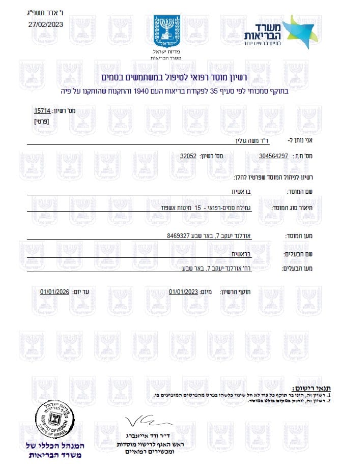רישיון מוסד רפואי של בראשית מרכז גמילה מסמים (למטה)