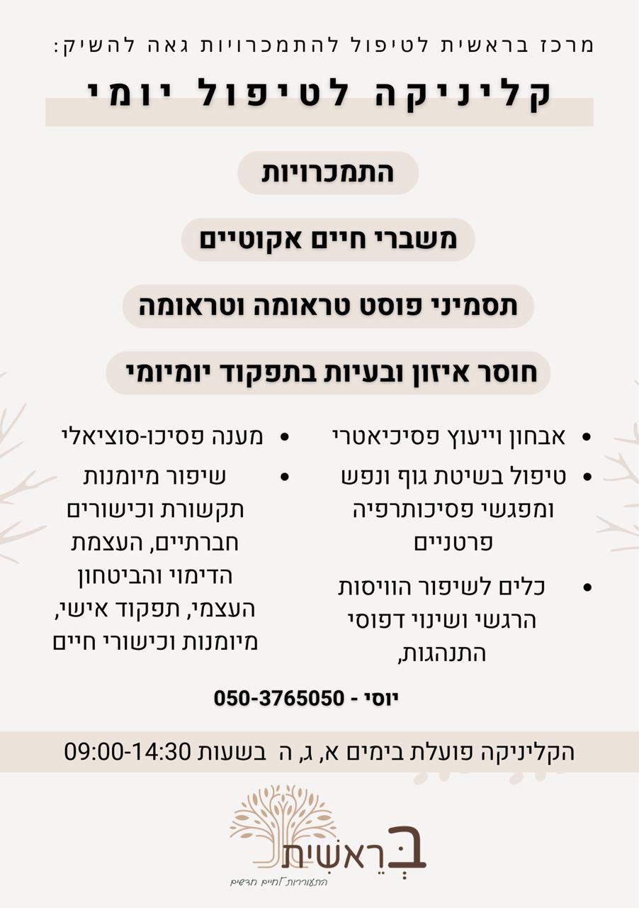 הקליניקה מהווה מענה טיפולי ייחודי, דיסקרטי, בבית חם ואינטימי. תכנית הטיפול כוללת מפגשי פסיכותרפיה, סדנאות: